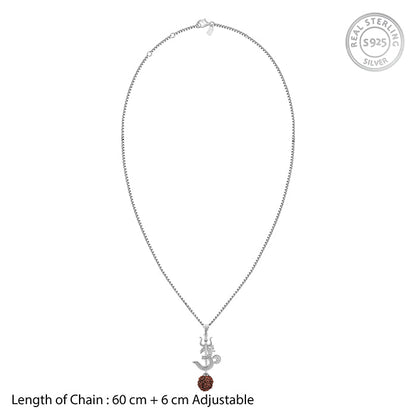 This silver pendant with box chain has a Trishul and om motif with a rudraksha dangling below.