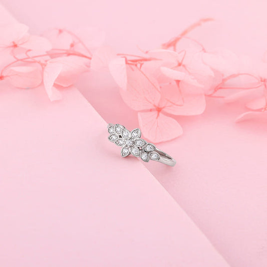 This silver ring features a floral motif with extended petals on both sides set with zircons.