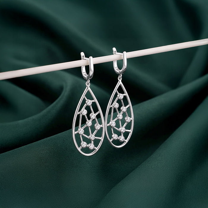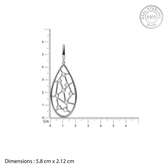 Silver earrings shaped in an oval silhouette, where sleek abstract lines move within, punctuated by zircons placed in...