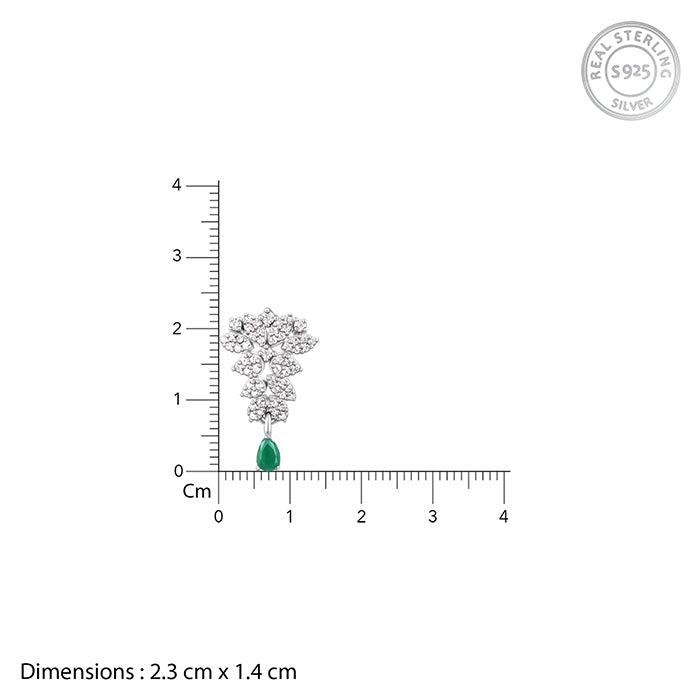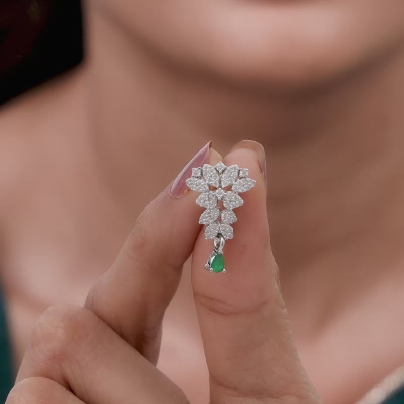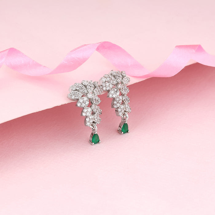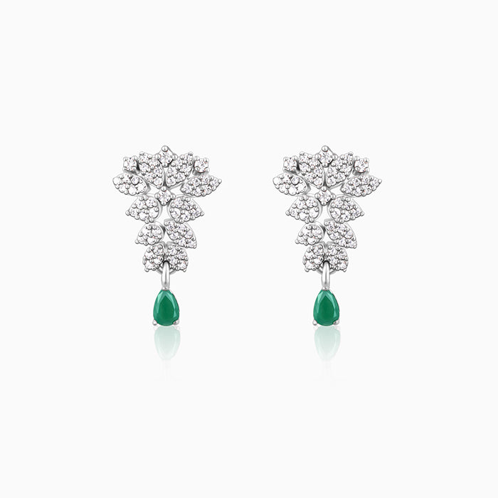 These silver earrings feature an intricate design studded with zircons, with a green-coloured stone in a droplet design dangling below.