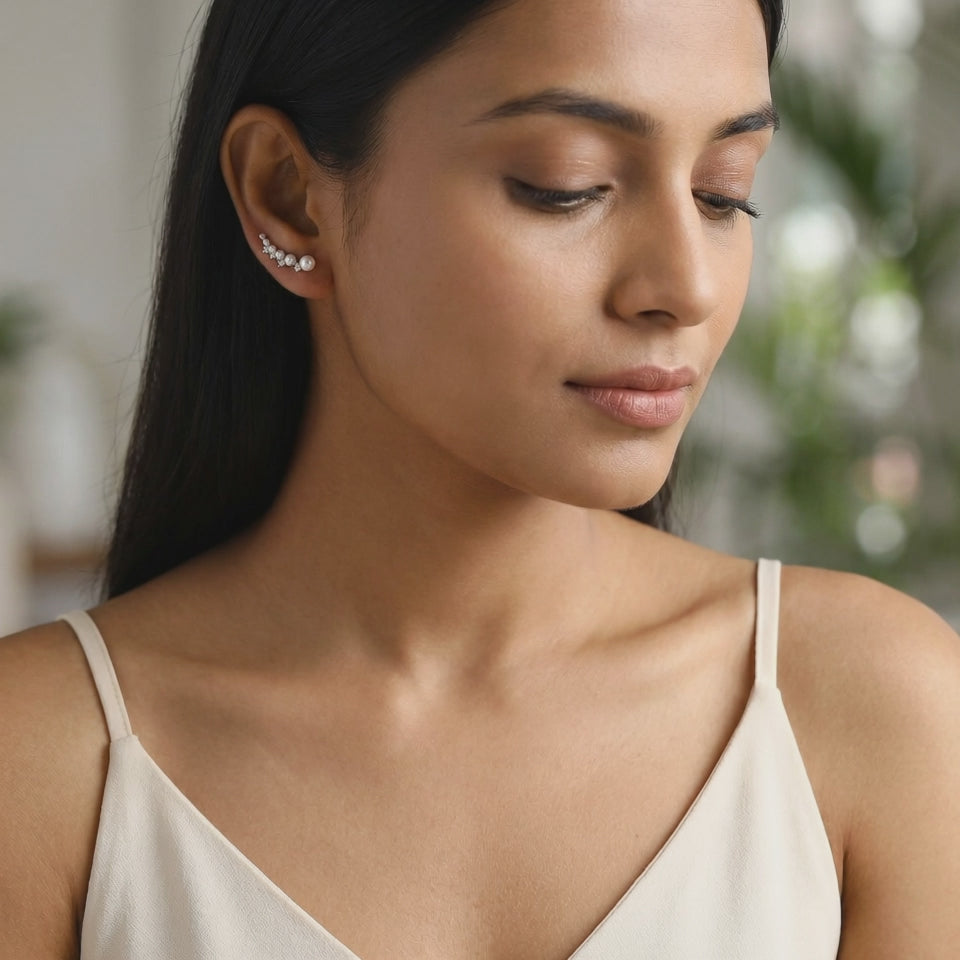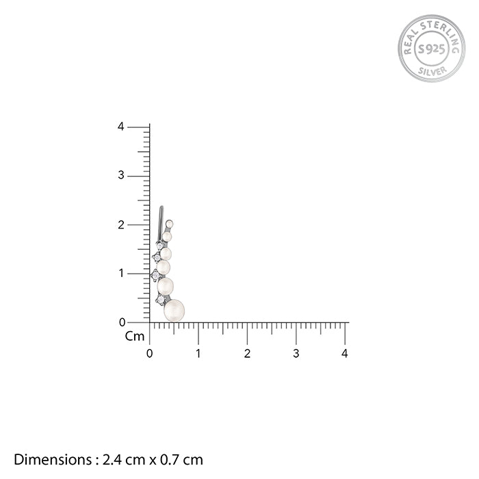 She is refined, confident, and drawn to modern classics. These silver earrings feature pearl climbers accented with shimmering zircons, creating a graceful rise that feels fresh yet timeless.