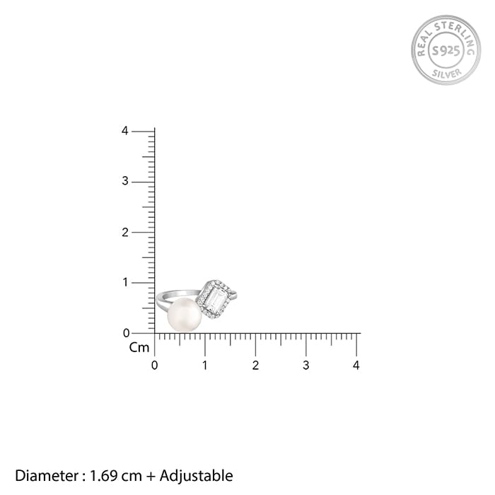 This silver open ring features a square motif adorned with a sparkling zircon on one side and a delicate pearl on the other.