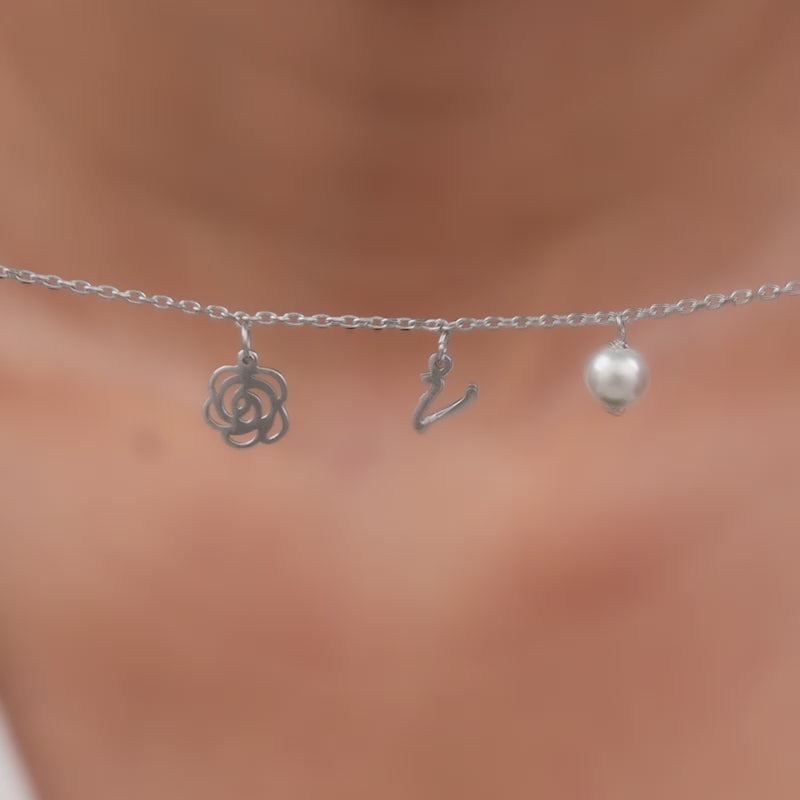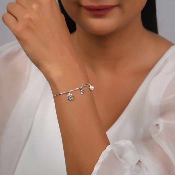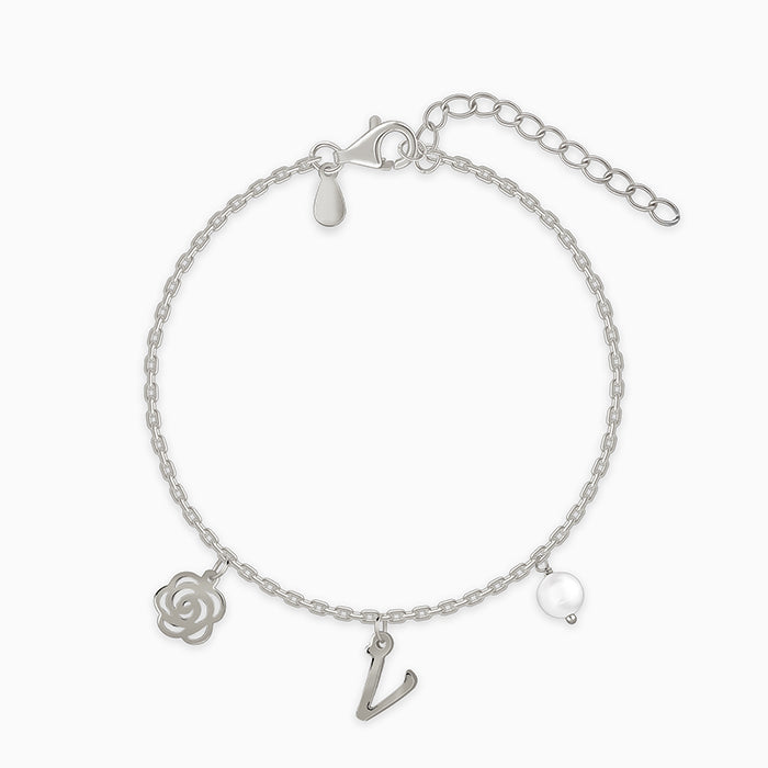 Designed to sit lightly on your wrist, this personalised silver bracelet brings together an initial charm, a rose motif, and a pearl accent. Just an easy reminder on what matters most for you.