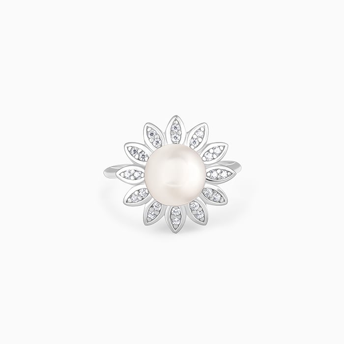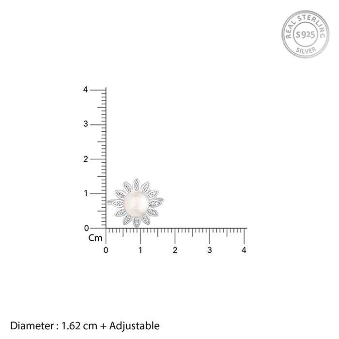 This silver ring features a blooming flower that is studded with zircons on its petals and encasing a bright pearl at the centre.