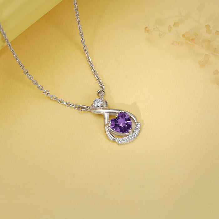 This silver necklace for women features a faceted coloured heart-shaped motif, elegantly cradled in a swirl-shaped setting with sparkling zircon accents.