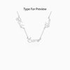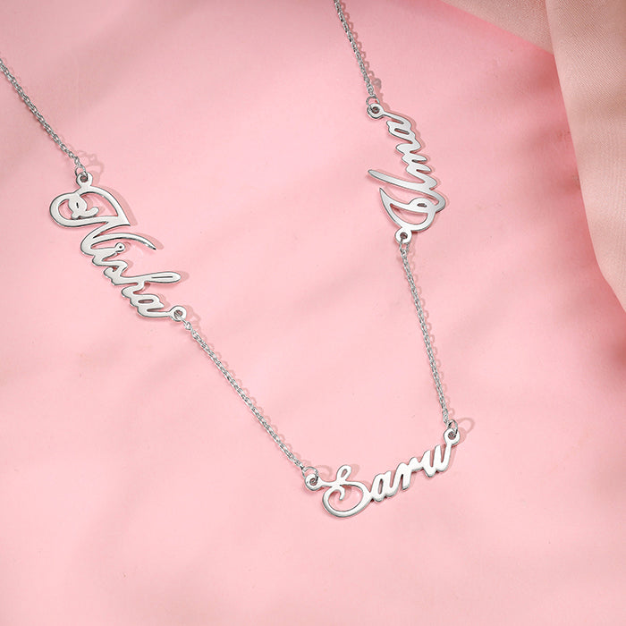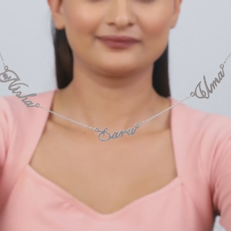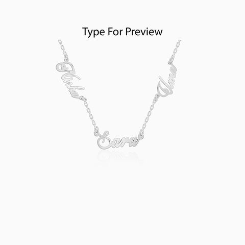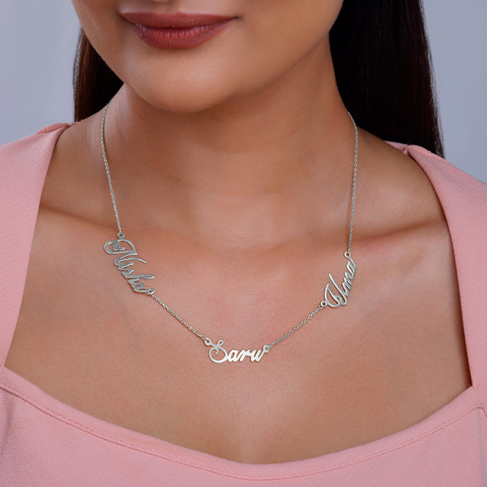 This personalised silver necklace for women features three names adjacent to one another.