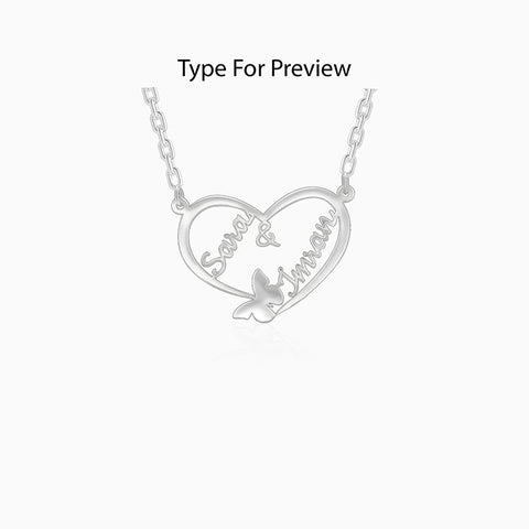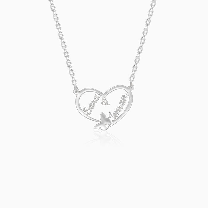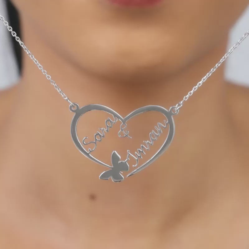This custom-made silver pendant features two names enclosed in a heart shape and with a butterfly motif at the bottom.