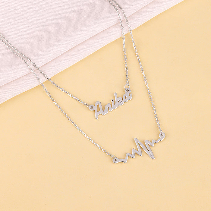 This personalised silver necklace for women features a dual-chain design—one layer showcasing a custom name and the other highlighting a sleek heartbeat motif. The elegant script font and minimal detailing give it a luxe finish, while the 925 silver ensures a radiant shine. It’s a unique blend of personalised jewellery and expressive design—perfect for gifting or self-love.