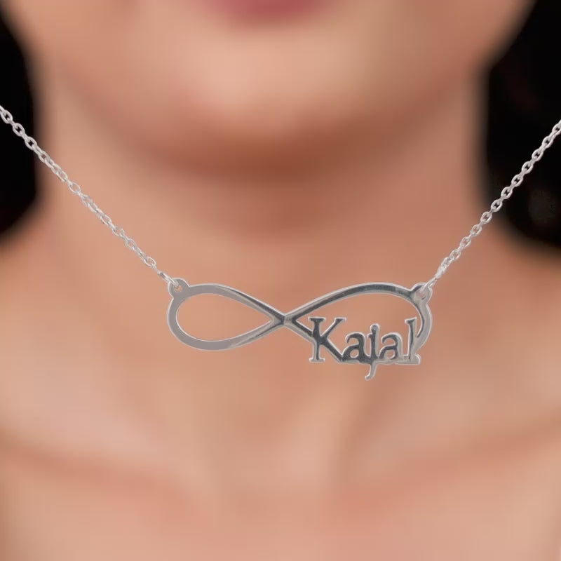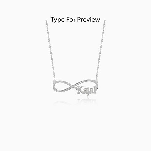 This personalised silver necklace for women features an infinity motif with a name of your choice sitting elegantly on one of the loops.