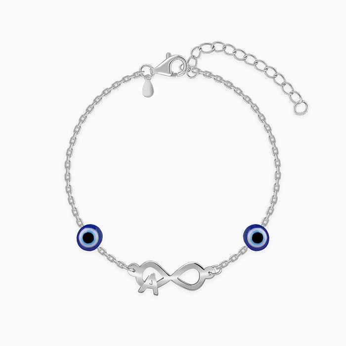 This personalised silver bracelet features an infinity symbol paired with your chosen initial and protective evil eye...