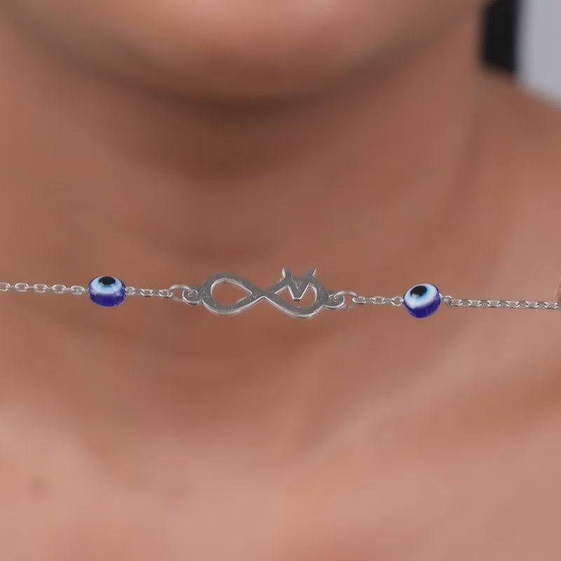 This personalised silver bracelet features an infinity symbol paired with your chosen initial and protective evil eye accents. Symbolic enough to mean something, stylish enough to wear every day.