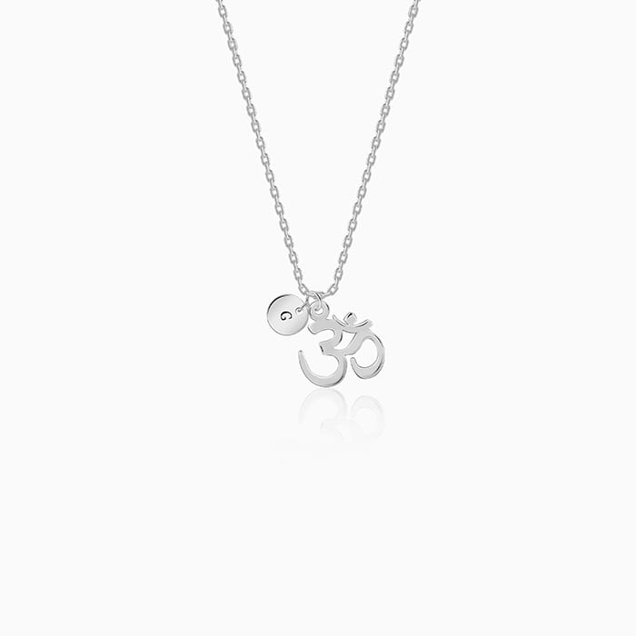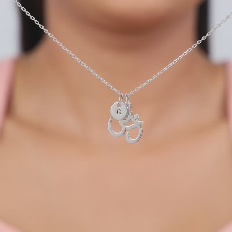 This personalised silver om charm pendant with link chain features an om motif with a circular charm dangling from the chain.