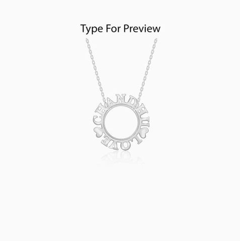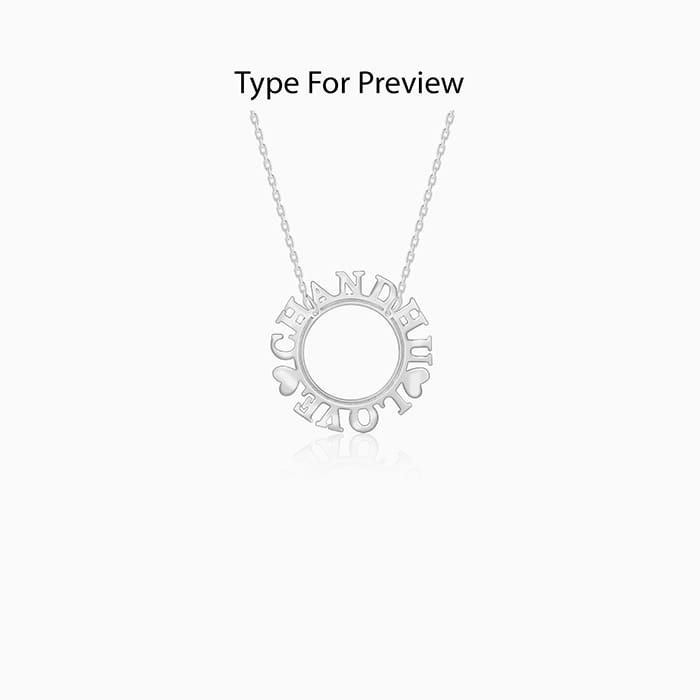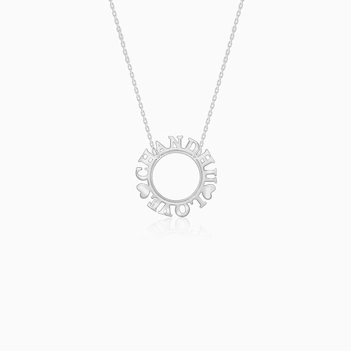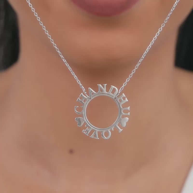 This silver customized name necklace for women features a circular shape with two names of your choice set around the outer rim and separated by two heart motifs.