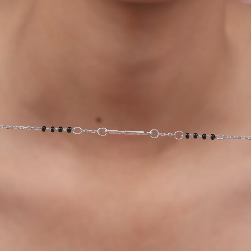This silver mangalsutra personalised bracelet for women features a sleek silver chain adorned with segments of black beads. At the centre lies a bold customisable initial charm, allowing you to personalise it with any letters of your choice.