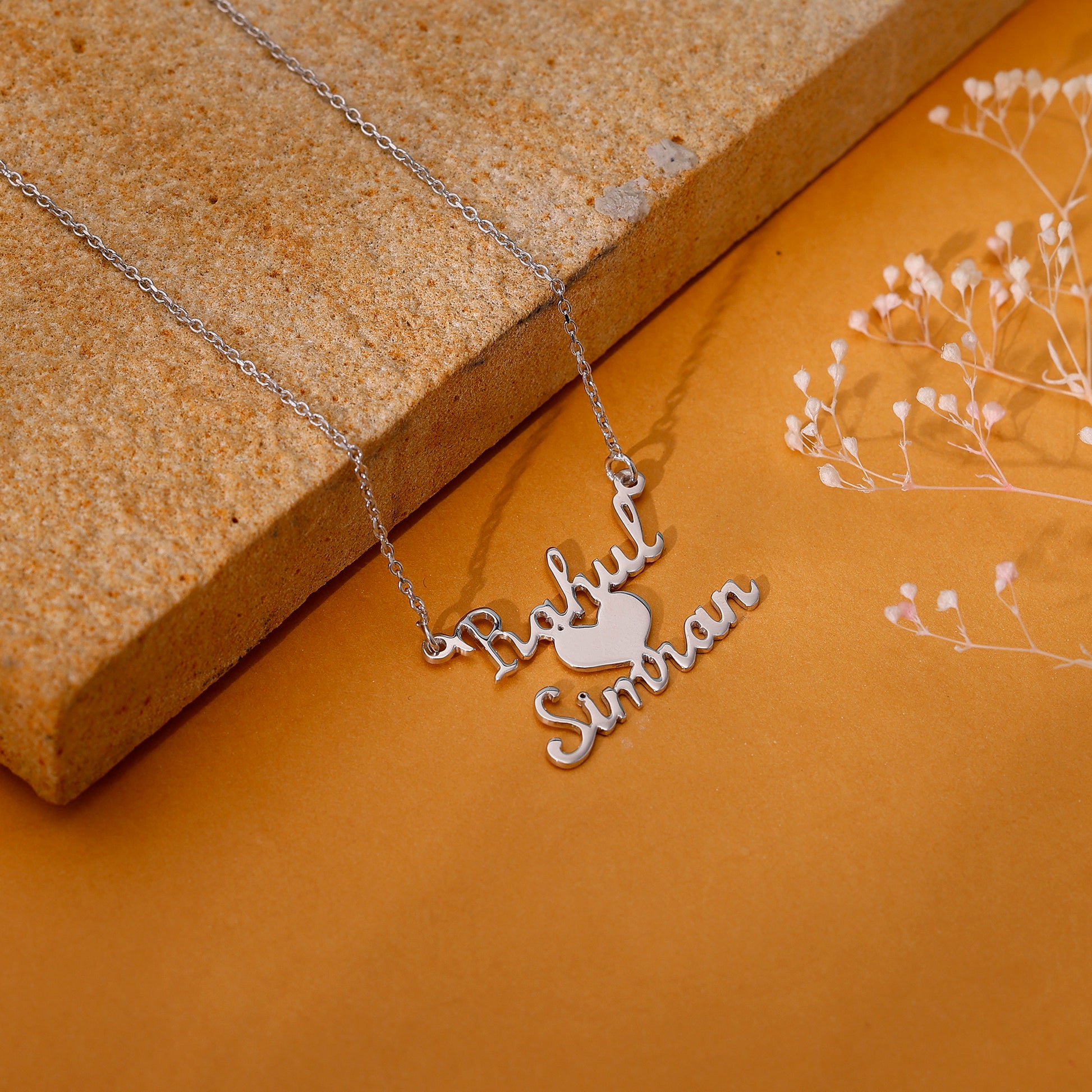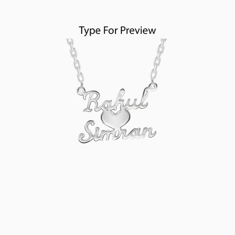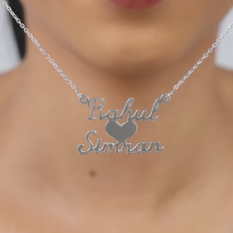 This custom-made silver pendant features two names with a heart motif at the centre.