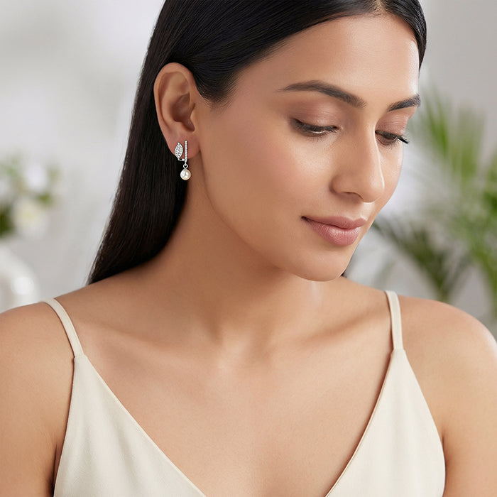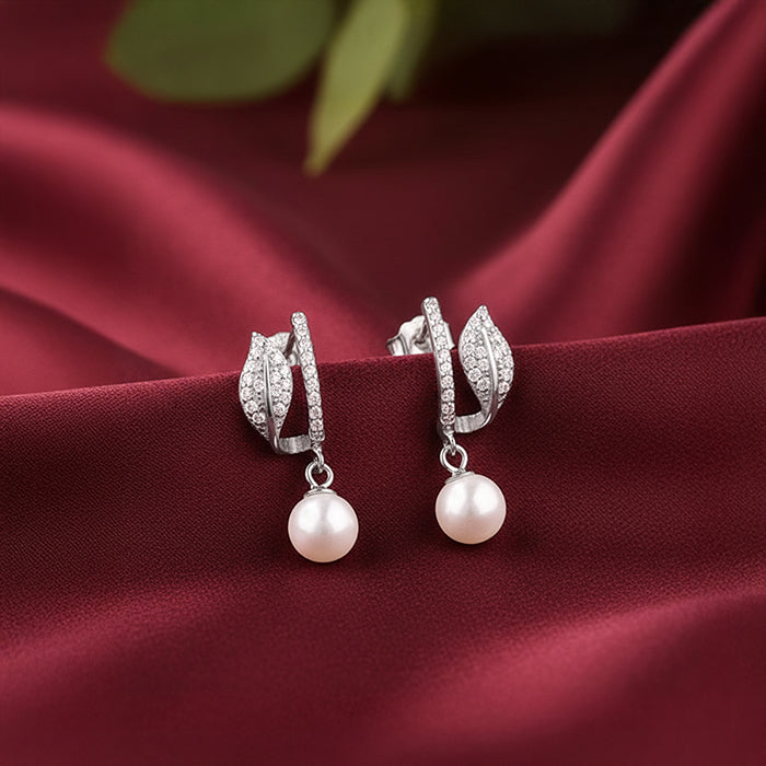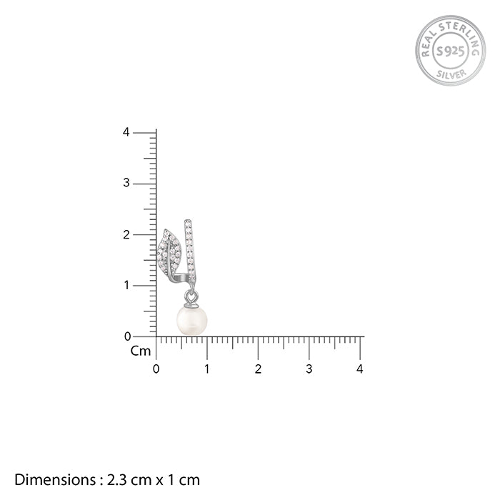 These silver earrings for women feature a leaf motif set with pavé zircons, paired with a graceful curved bar. Finished with luminous white pearl drops, they effortlessly elevate any outfit.