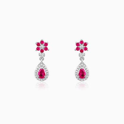 These silver earrings have a floral motif with a pear drop motif below, both studded with zircons and pink-coloured stones.