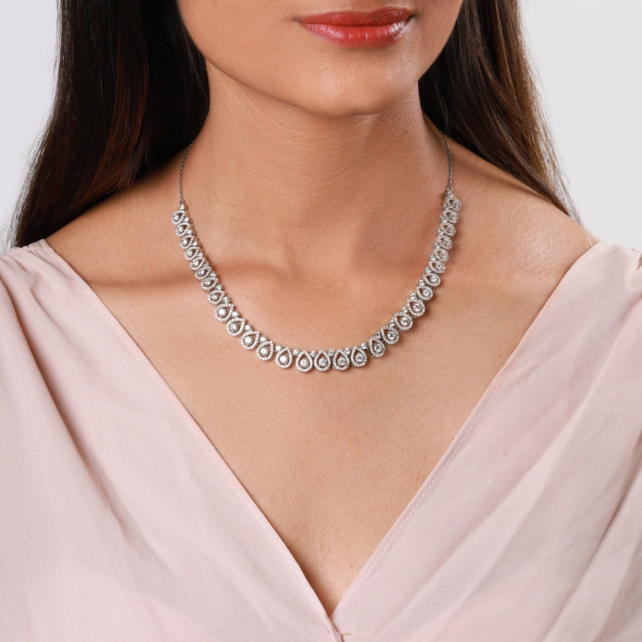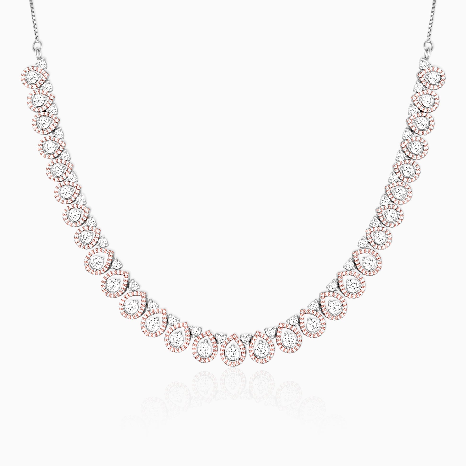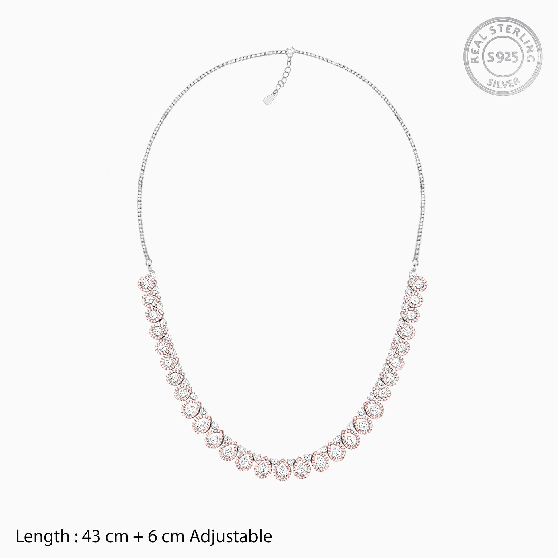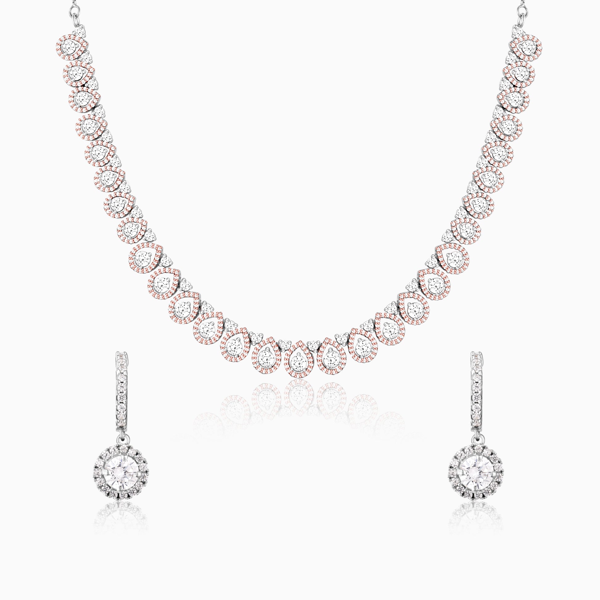 This rose gold set has an elegantly designed necklace and silver drop earrings studded with zircons.