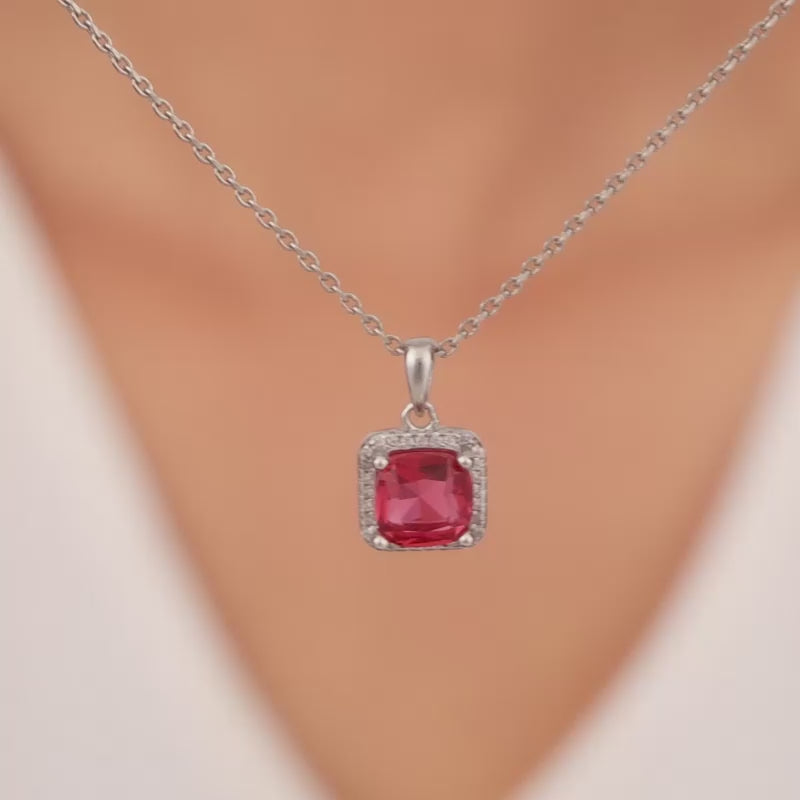 This silver pendant with a link chain features a square shape with pink-coloured stone at the centre, and zircons studded around.