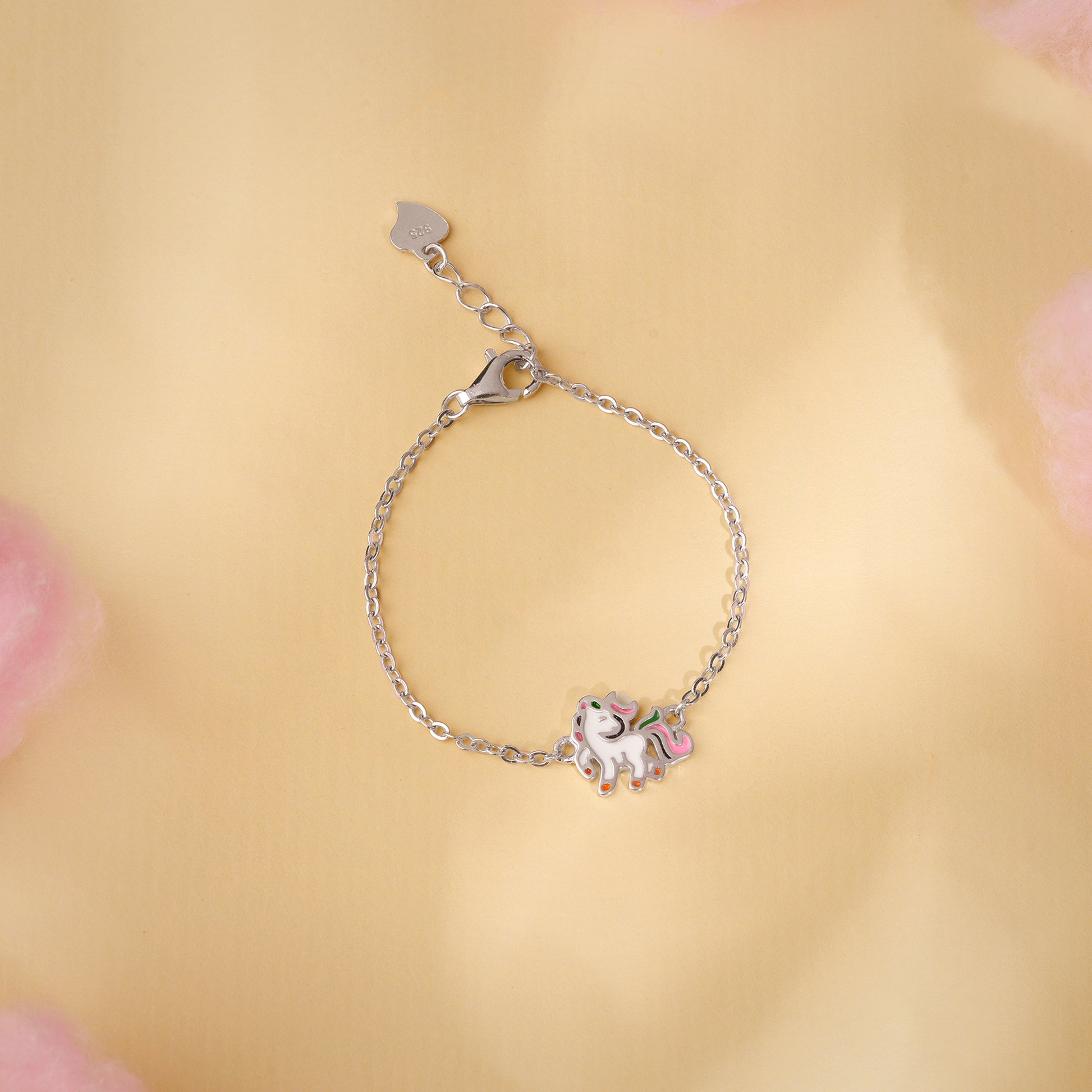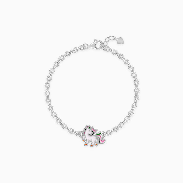 This silver kids bracelet features a vibrant enamel unicorn design.
