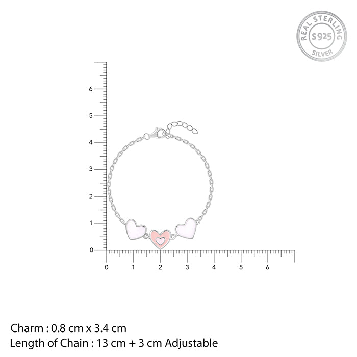 This silver kids bracelet features triple heart motifs with colourful enamel.