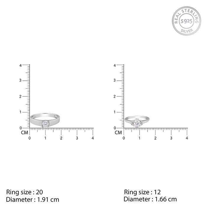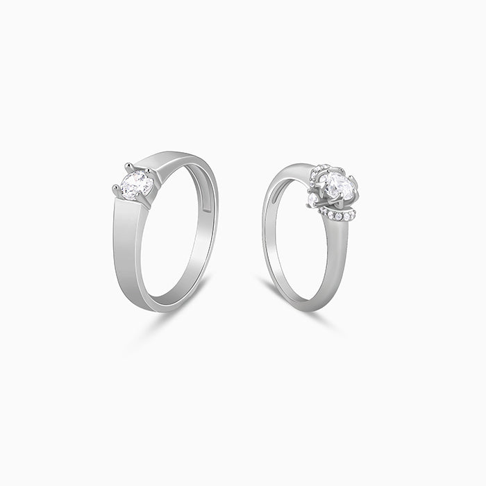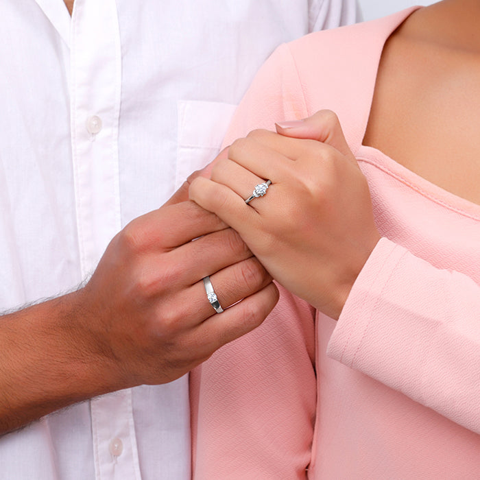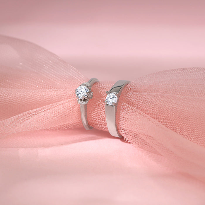 These silver couple bands feature an elegant design, with a large zircon stud at the centre of the male band and the female band accentuated by smaller zircons surrounding the central stone.
