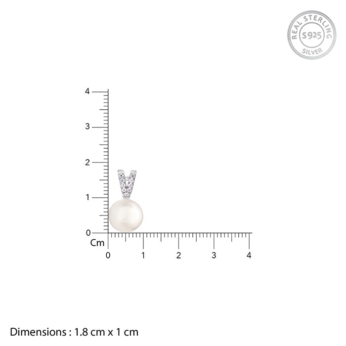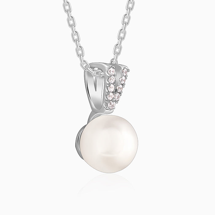 This silver pendant with a link chain features a pearl and zircon studded above in a v-shape.