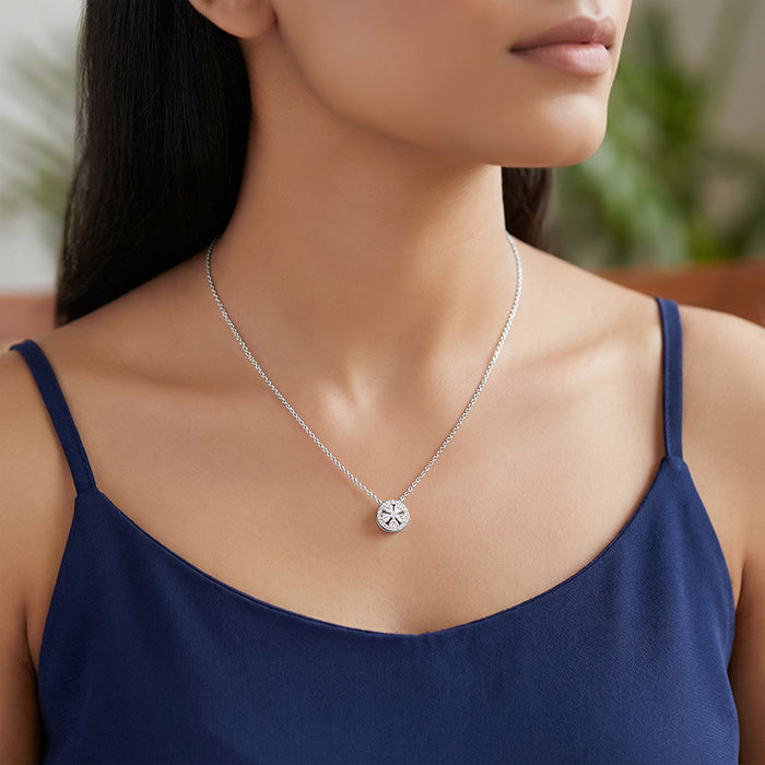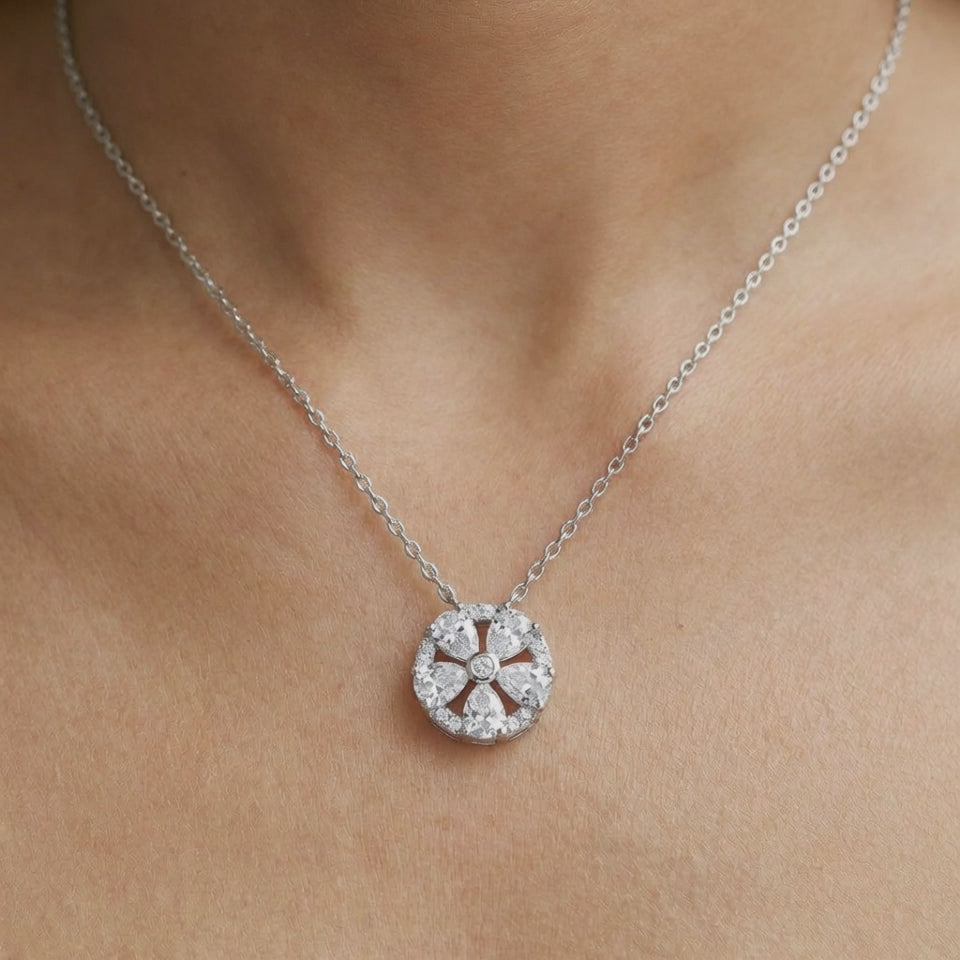 She is calm, modern, and drawn to forms that feel complete and balanced. This silver pendant for women features a circular centre set with shimmering zircons, creating a look that is timeless and quietly radiant.