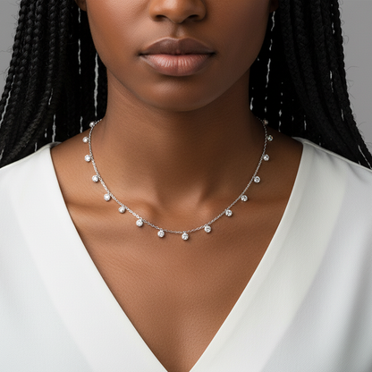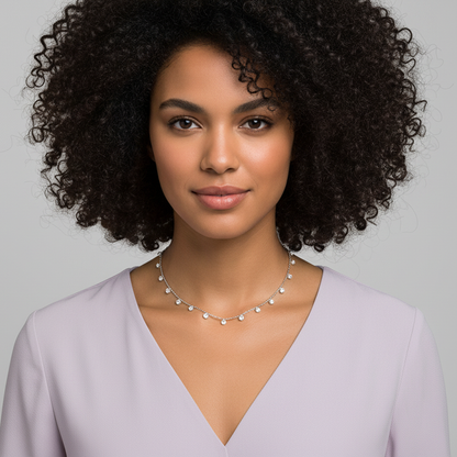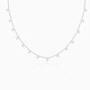 This silver necklace features circular zircon charms interspaced throughout the chain length.