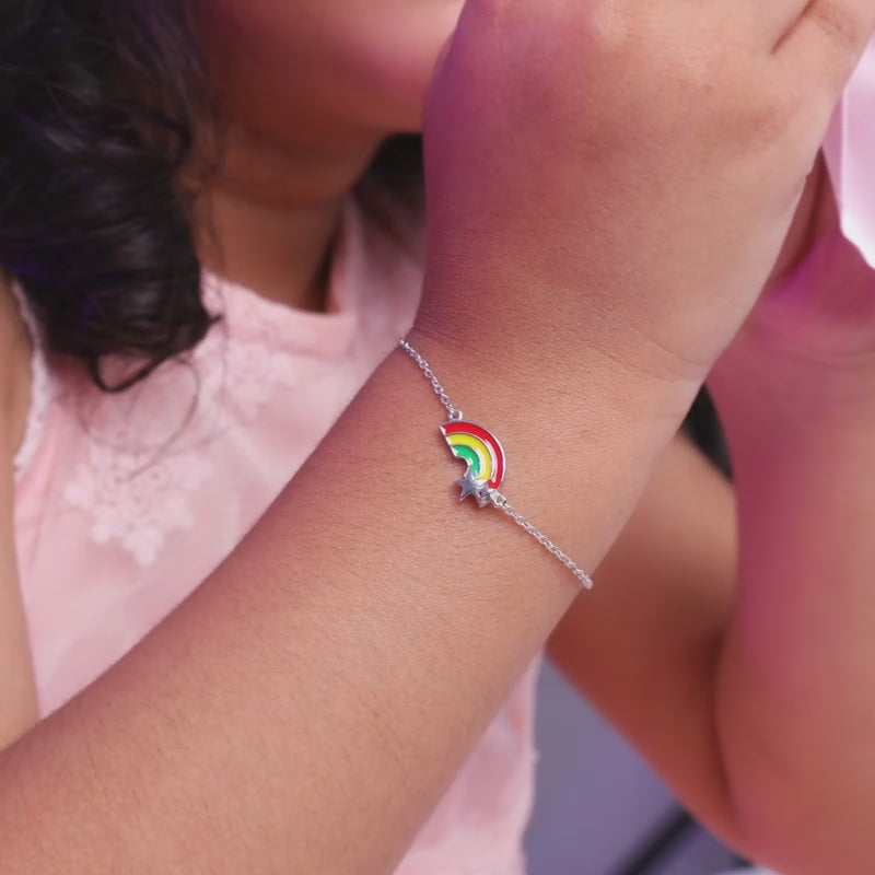 This silver kids bracelet features a rainbow arc detailed with colourful enamel. Above the rainbow, star motifs are placed.