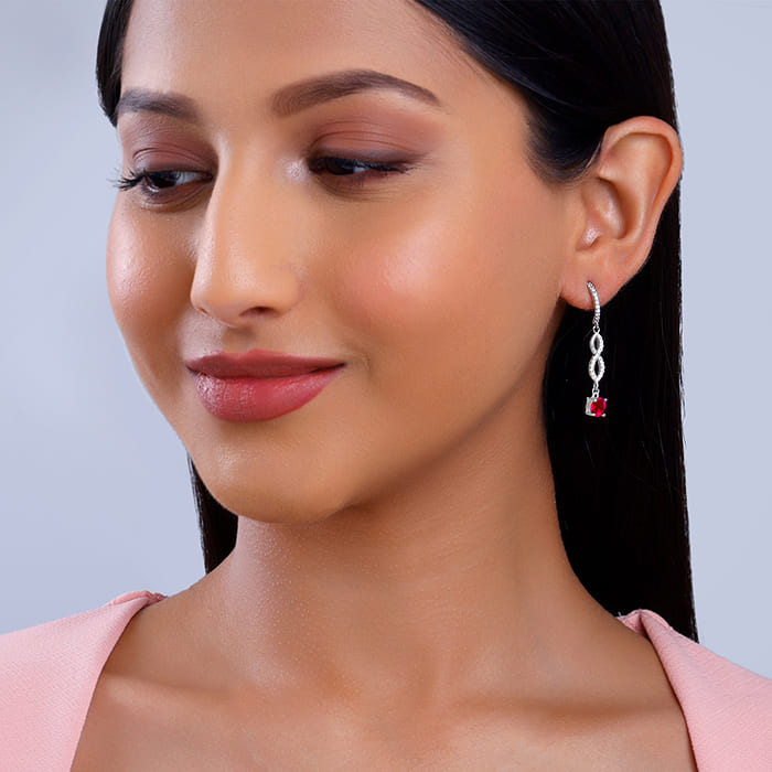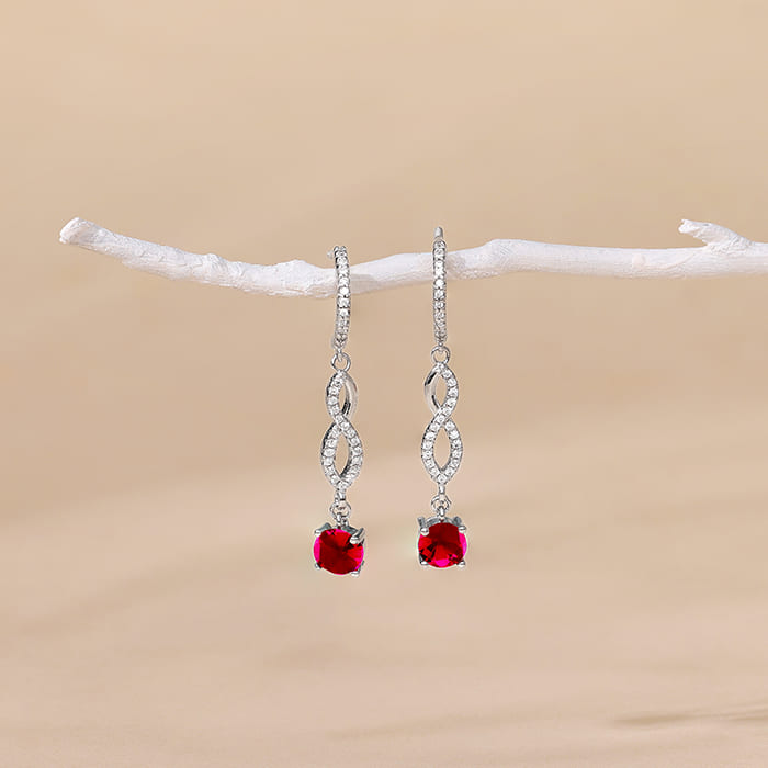 These silver J-hoop earrings feature an infinity motif with zircons and a red-coloured stone dangling from it.