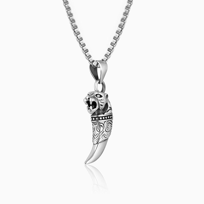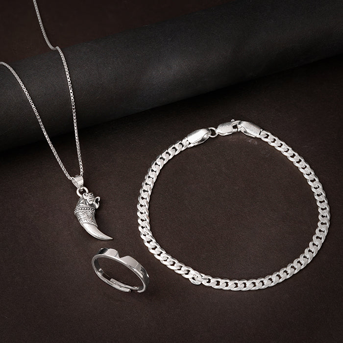 This silver set for men includes a bracelet, a ring, and a pendant. The mens bracelet features an interconnected link design, while the ring showcases a curated V-shape on a sleek, plain band. The pendant for men depicts a tiger atop the charm, with intricate detailing across the rest of the piece.