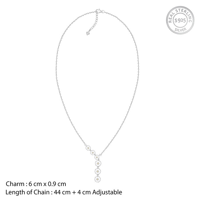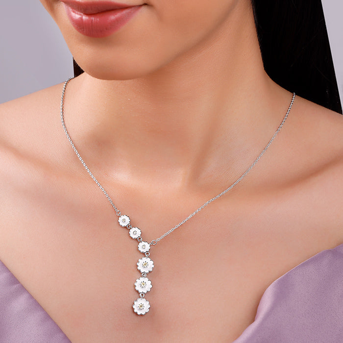 Like a daisy that always turns toward the light, this lariat necklace is a reminder that she deserves to feel gently held, beautifully seen, and endlessly celebrated. The enamel petals, painted with care, frame a zircon that catches light the way she catches hearts - softly, effortlessly, without trying.