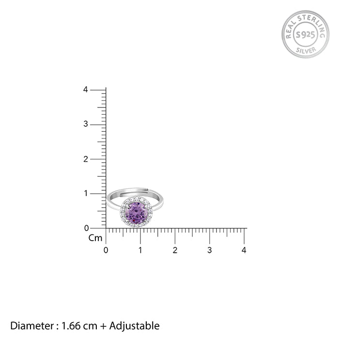 This silver ring has a circular design set with zircons nestling a purple-coloured stone in the centre.