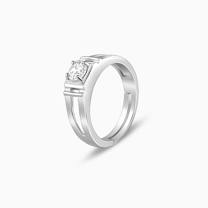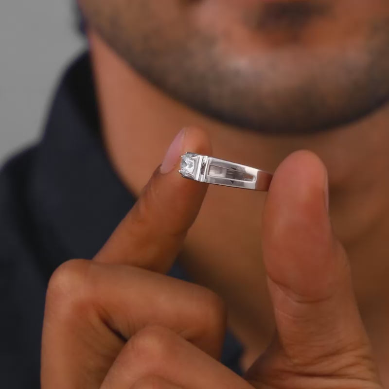 This ring captures the commanding presence of a man with vision - steady, confident, and unwavering in every stride of life. A single round-cut zircon shines in a sleek bezel-style square mount, while the split-shank band with open gaps adds a bold, modern edge to his signature style.
