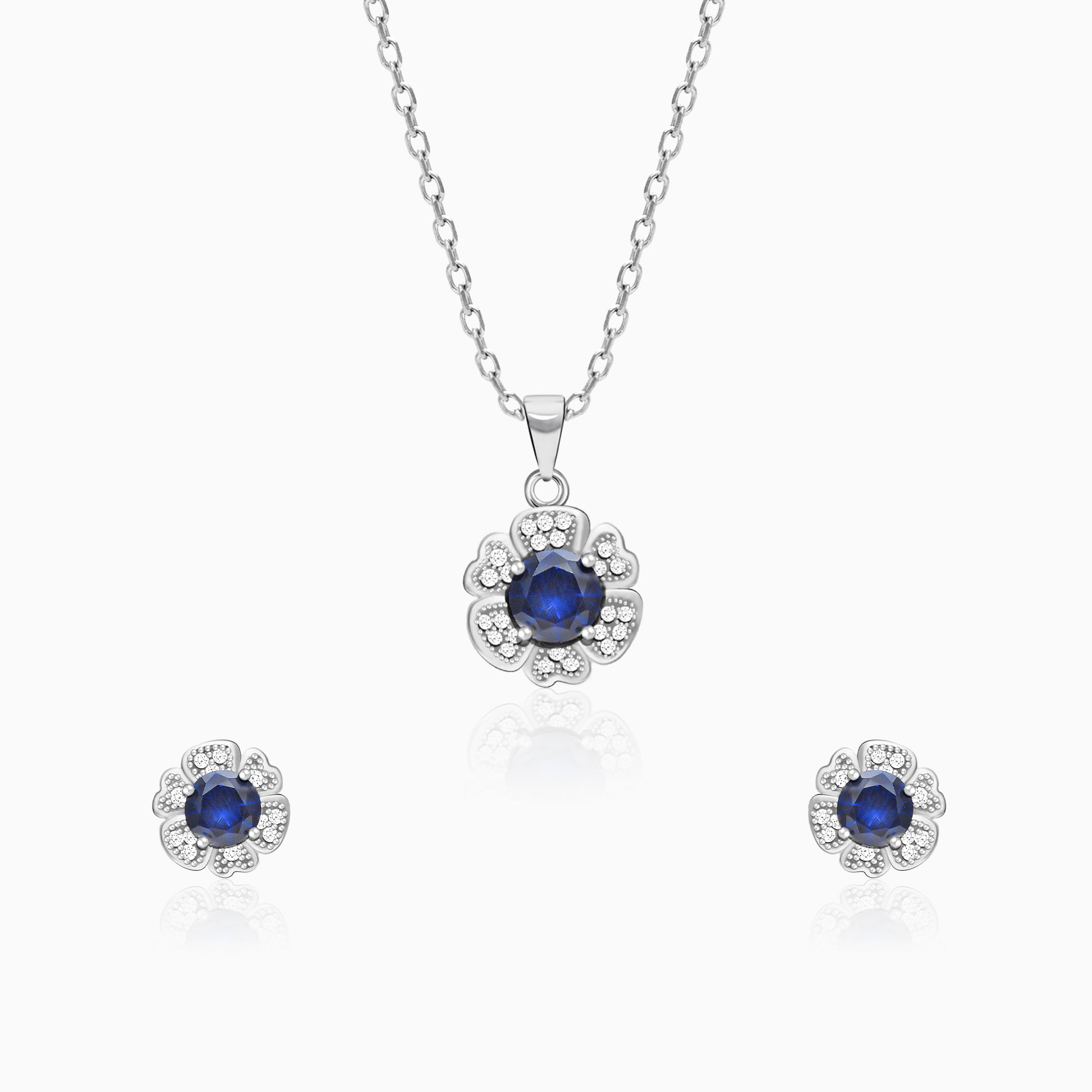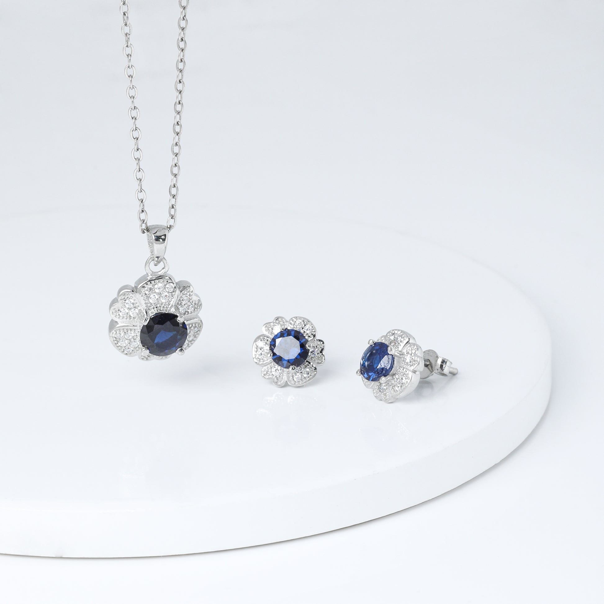 - Includes the Silver Royal Blue Bloom Pendant With Link Chain and Silver Royal Blue Bloom Studs.