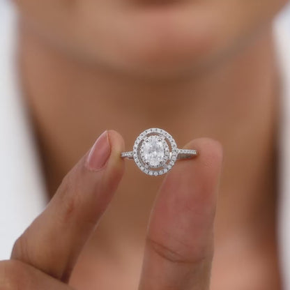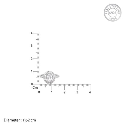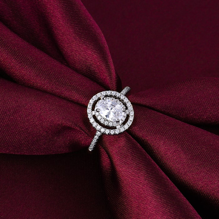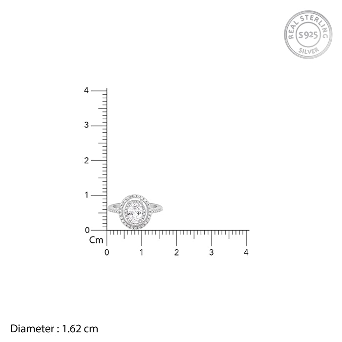 This silver ring features an oval zircon nestled in a layer of zircons, embedded in an oval motif on a band set with zircons.