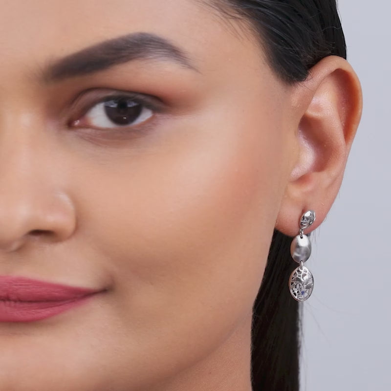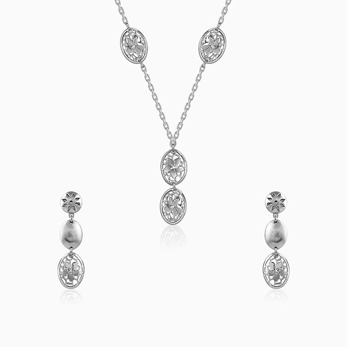 This silver jewellery set features a necklace and matching drop earrings designed with floral motifs, polished oval l...