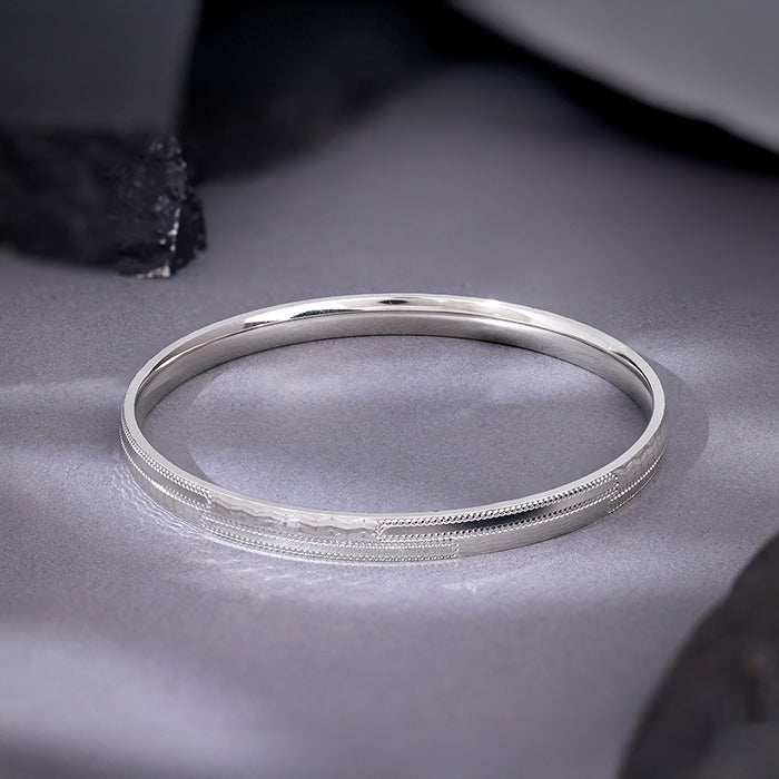 This silver kada for men captures a bold, grounded, and effortlessly commanding vibe. It features a wavy design with millgrain detailing along the band.