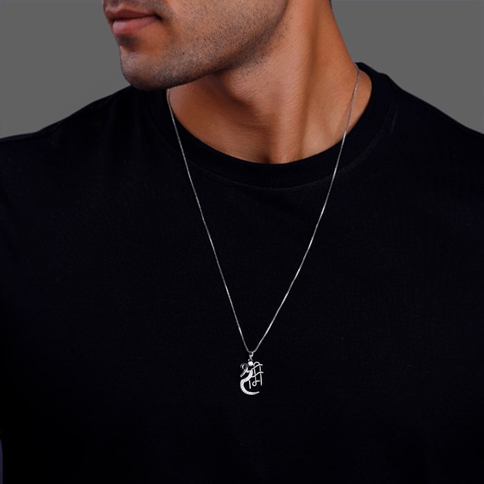 This silver pendant with a box chain features a shree ram word with zircons.