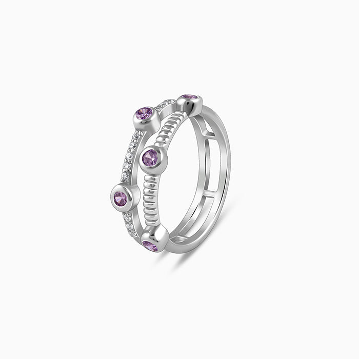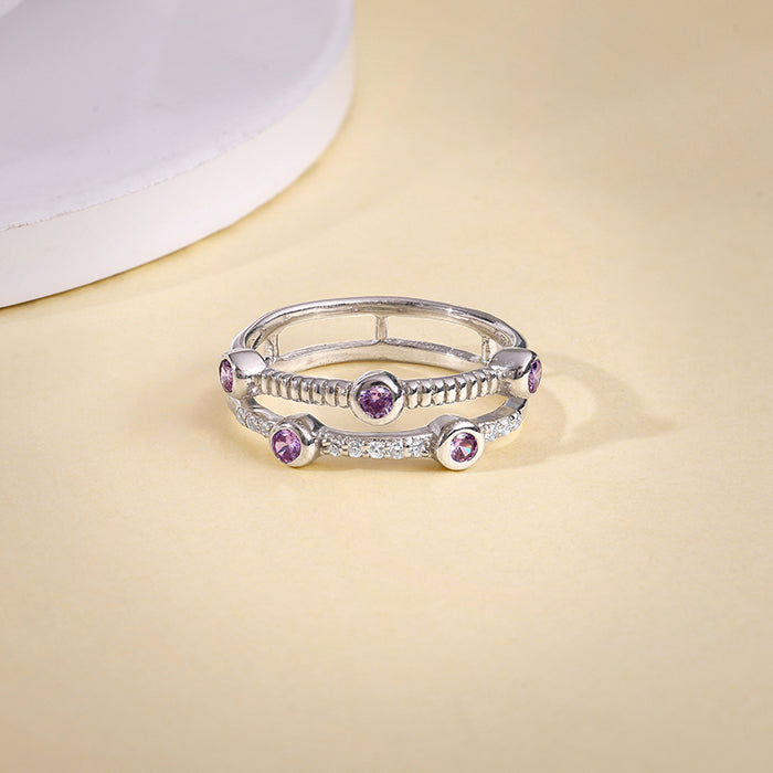 This silver ring for women features a dual-ring design. One has a twisted pattern, while the other is studded with zircons. Each ring has coloured stones set in bezel settings, adding a modern twist.