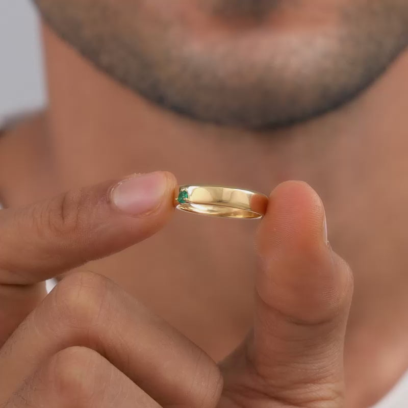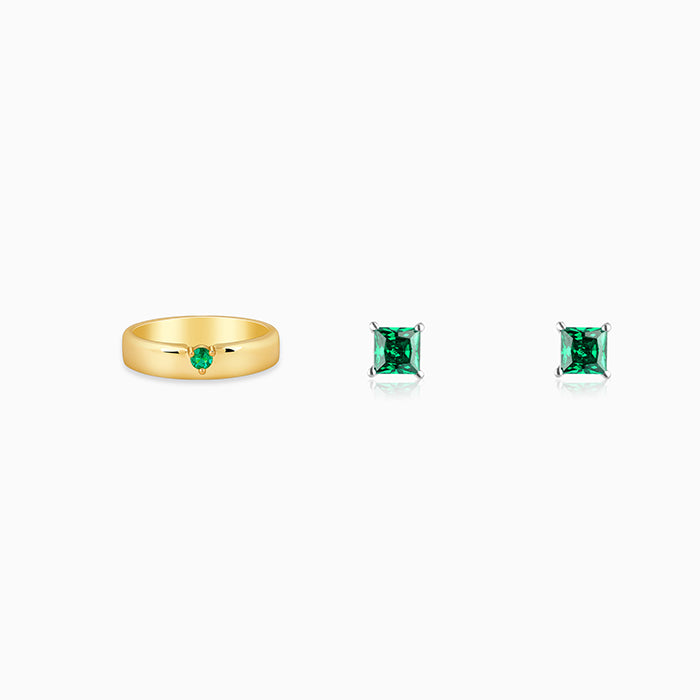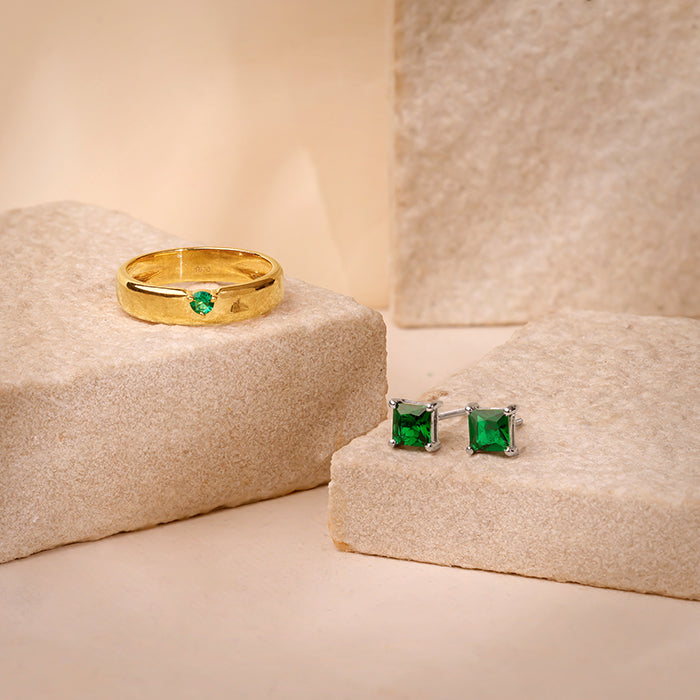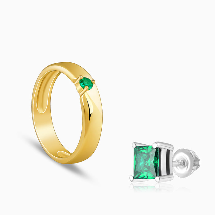This silver set for men includes a ring and a pair of studs. The ring features a flat band with a single round green-coloured zircon. It is set at the centre for a bold yet elegant look. The silver earrings feature an emerald square design.