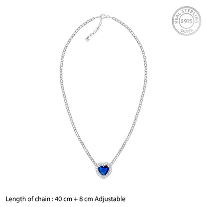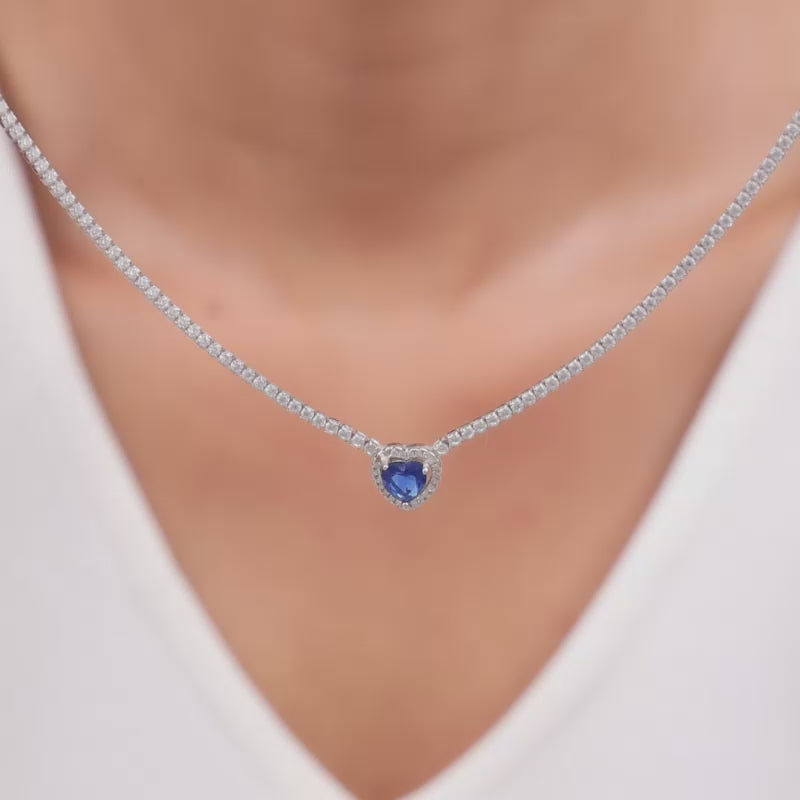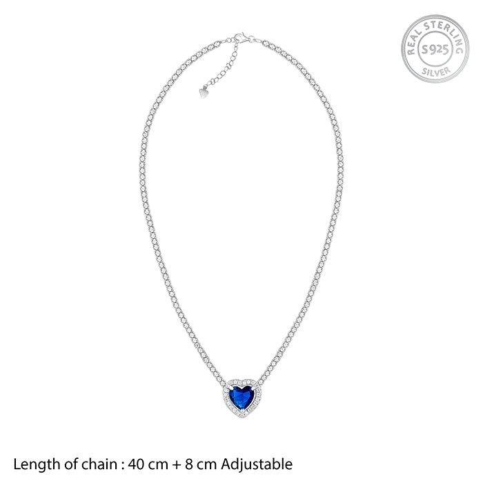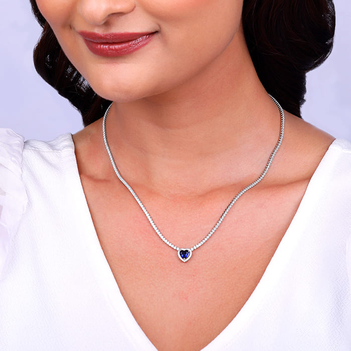 This silver necklace features a heart motif with a blue-colored stone placed in the center and zircons studded around, including the chain.