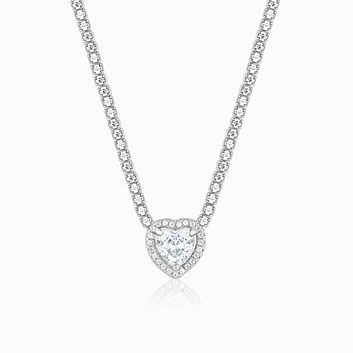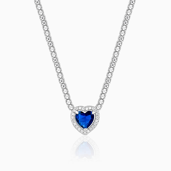 This silver necklace features a heart motif with a blue-colored stone placed in the center and zircons studded around, including the chain.