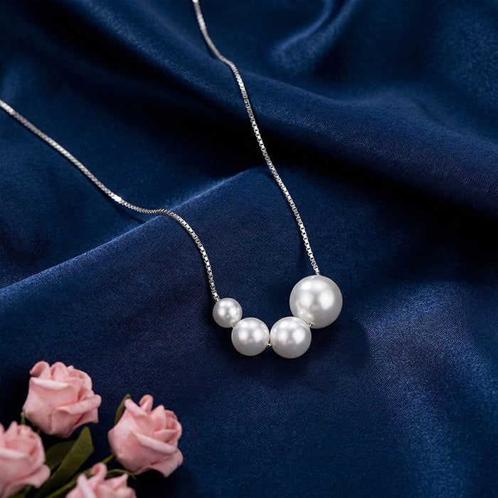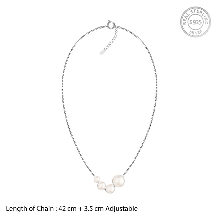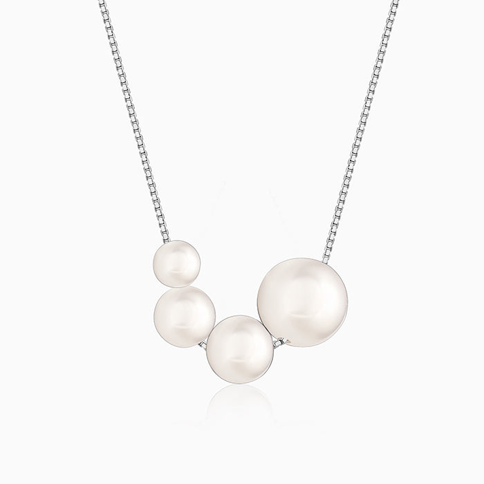 This silver necklace for women features a cluster of four graduated pearls. The asymmetrical arrangement creates a modern, flowing silhouette that reimagines the classic pearl aesthetic.