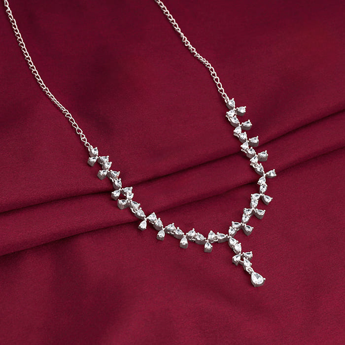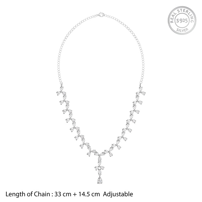 The silver necklace has three petal floral motifs with a dangling pear drop motif, all studded with zircons.