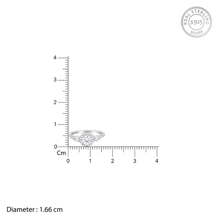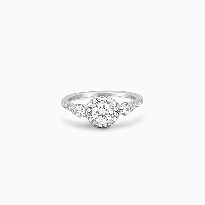 This silver ring has a circular zircon nestled within a layer of zircons flanked by zircons. The band is studded with zircons.