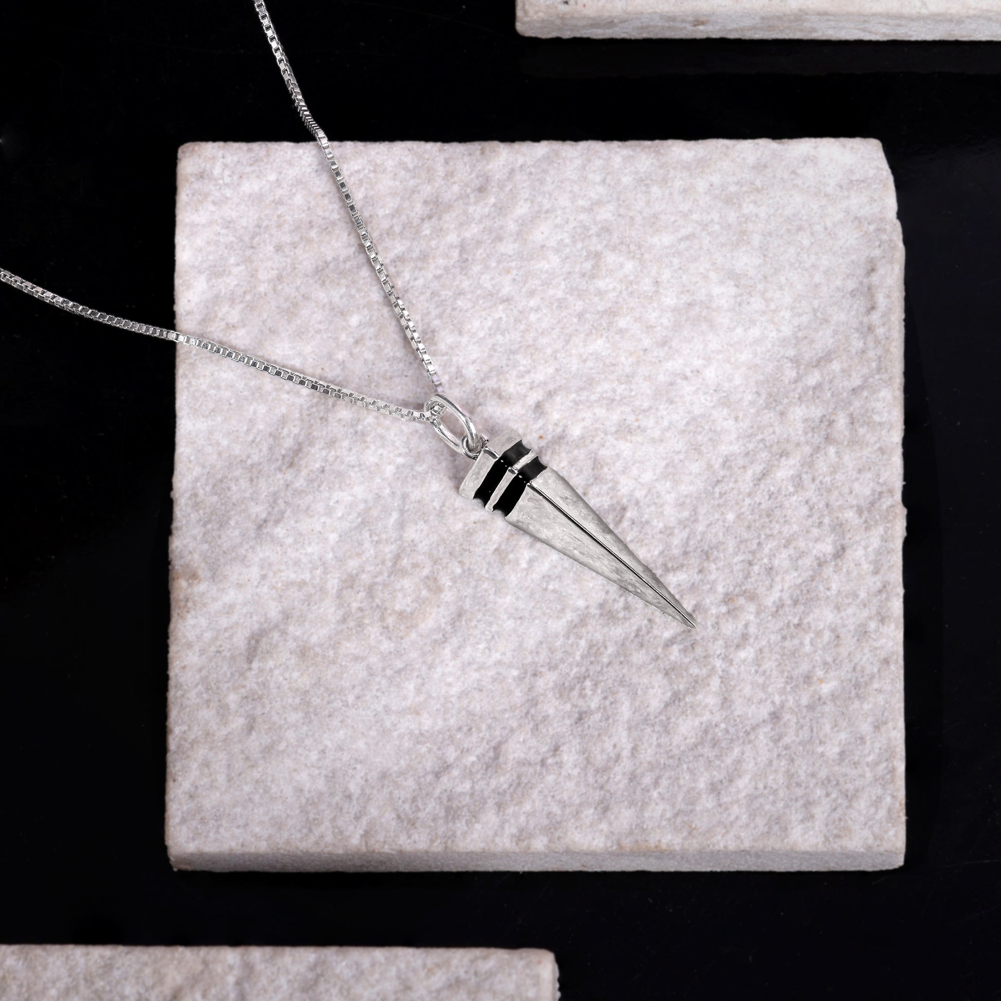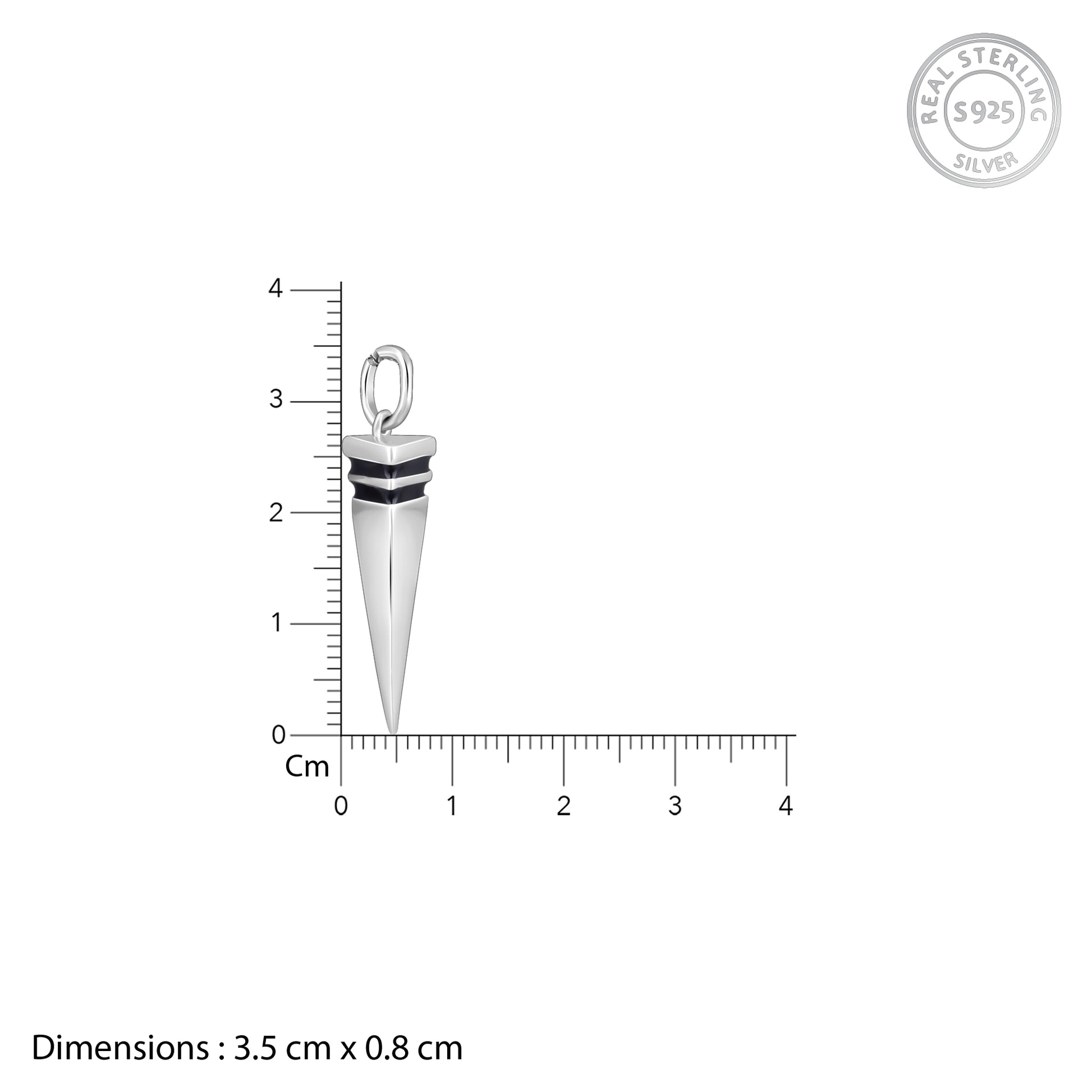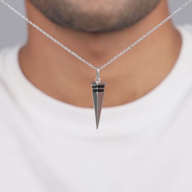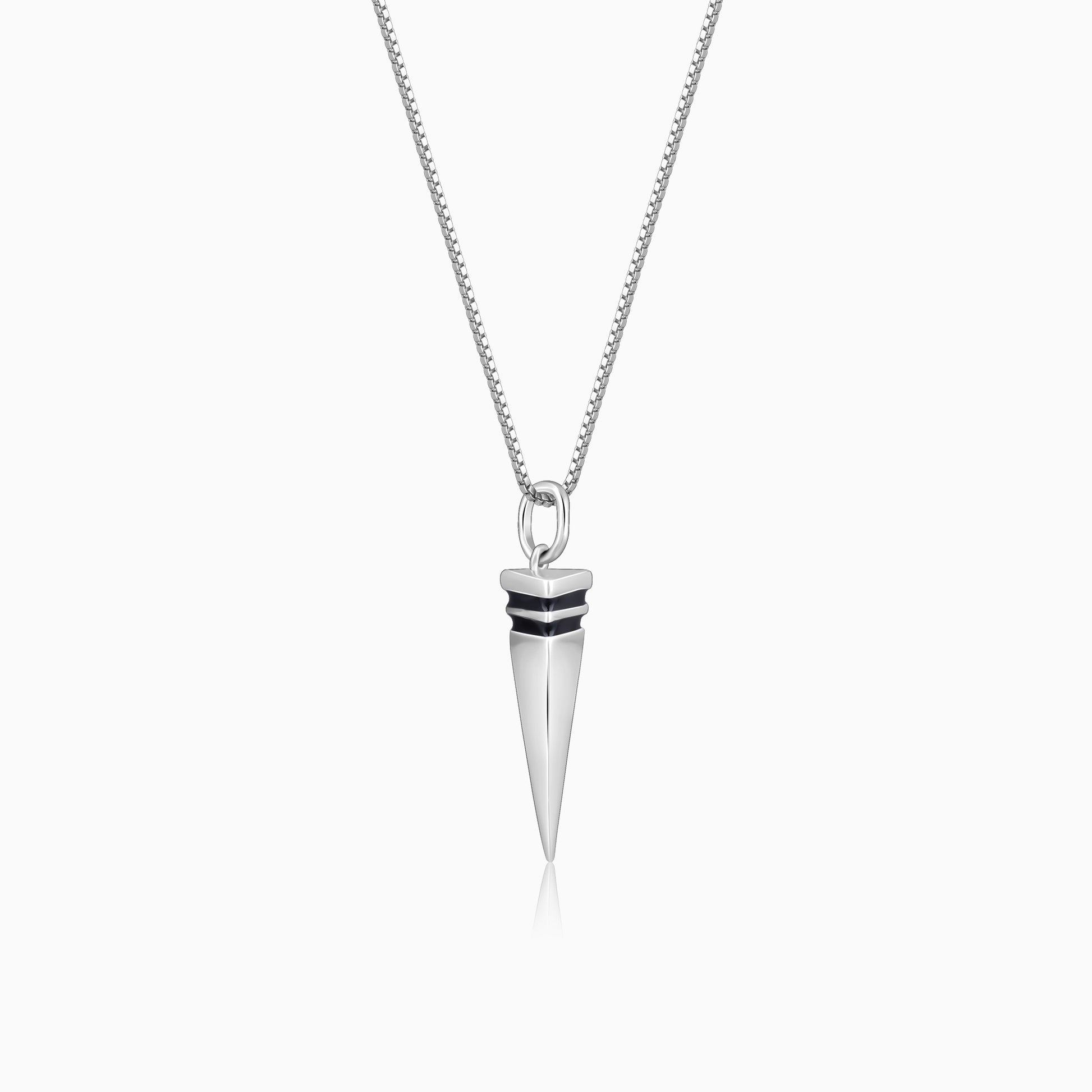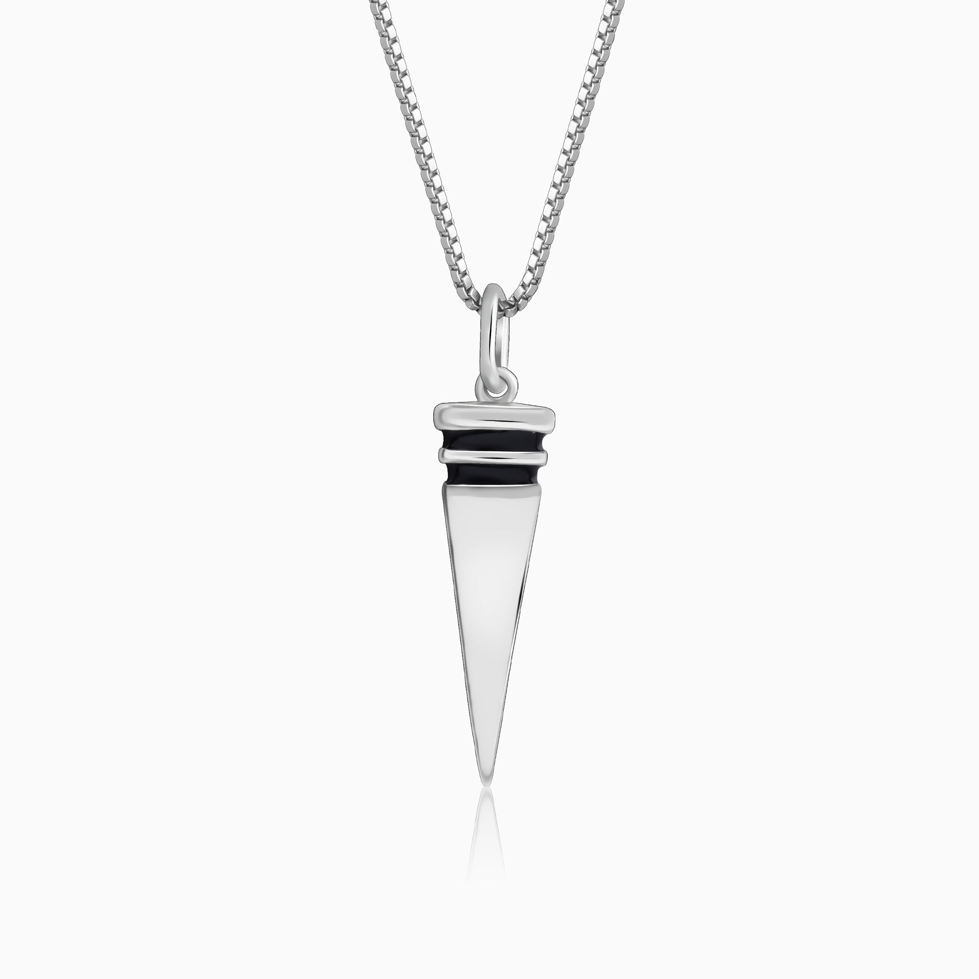 This silver mens pendant features a sleek spike design, accented at the top with two horizontal black colour coatings.