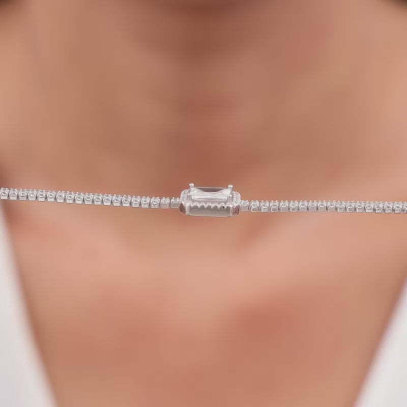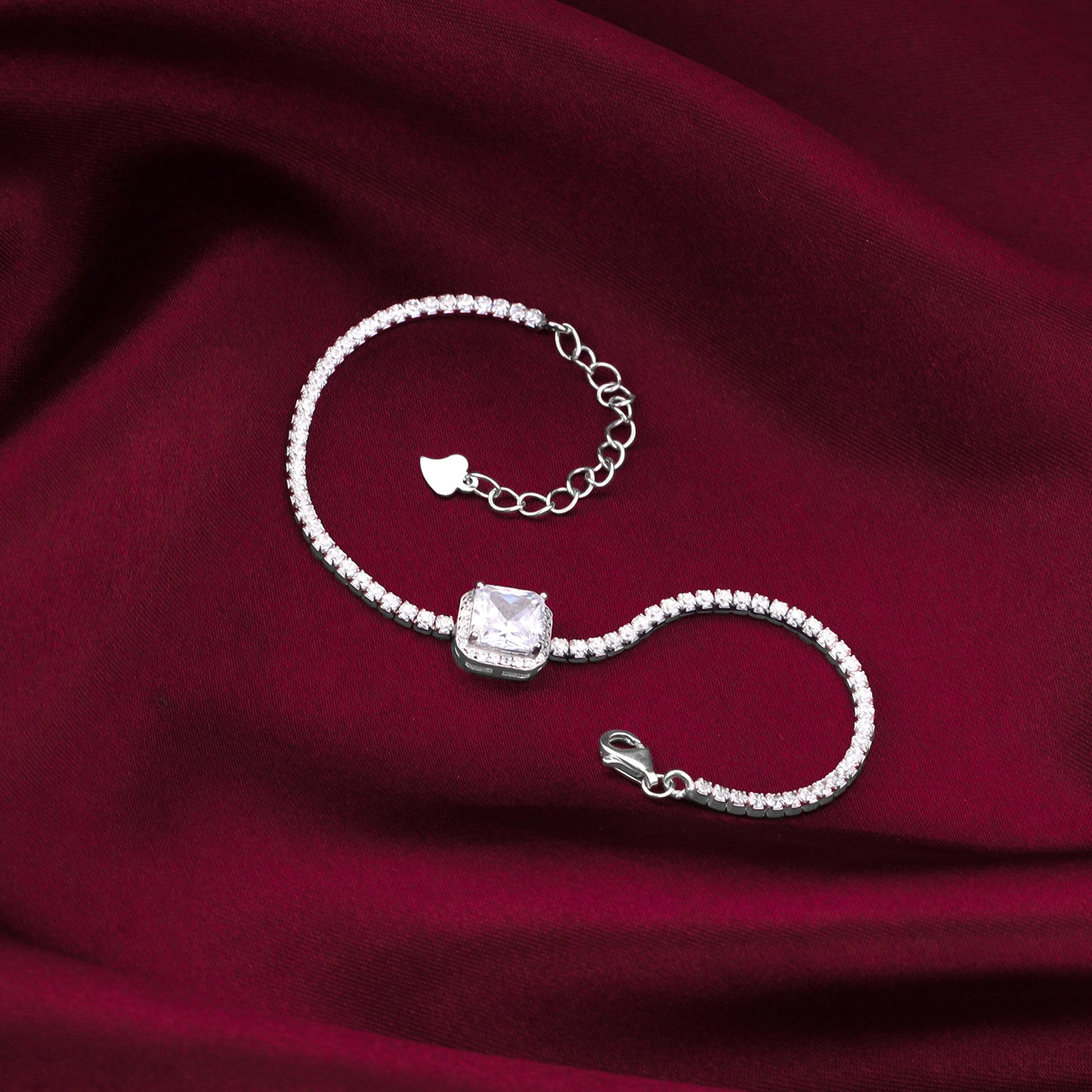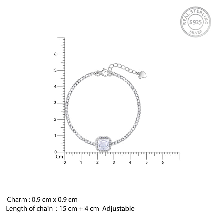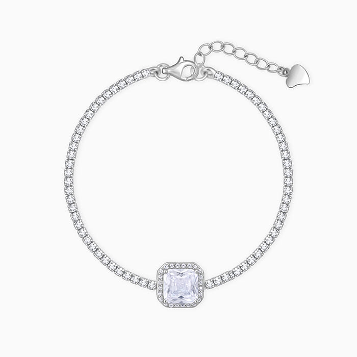 This silver tennis bracelet has a square zircon placed in the centre of a zircon studded chain, with a zircon layer around it.