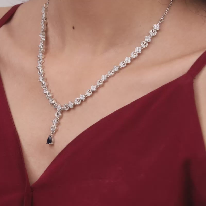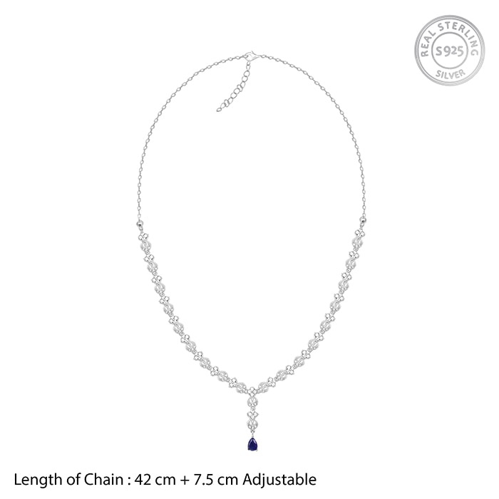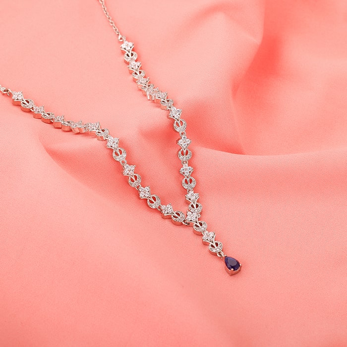 This necklace features a gorgeous flower motif with a blue dew drop motif dangling at the centre. All the motifs are adorned with zircons, adding a touch of sparkle and brilliance.